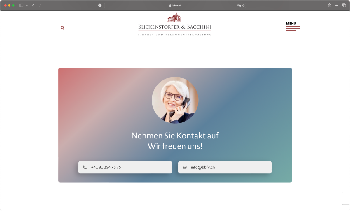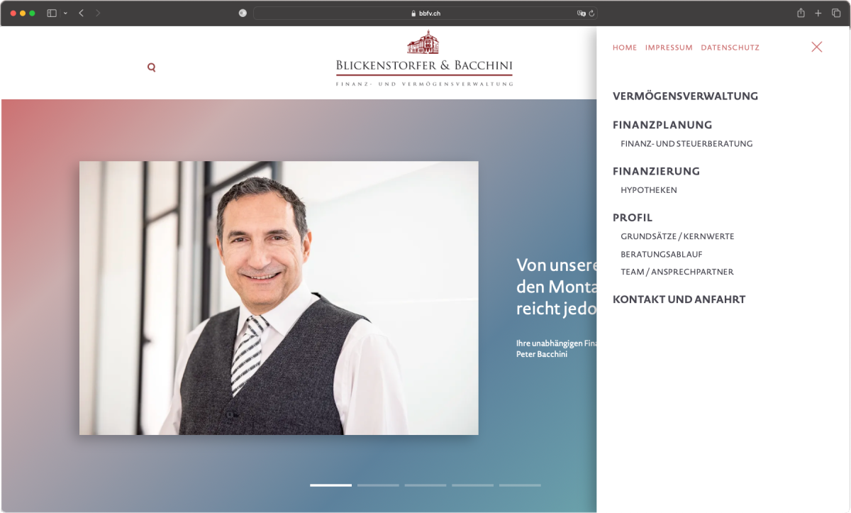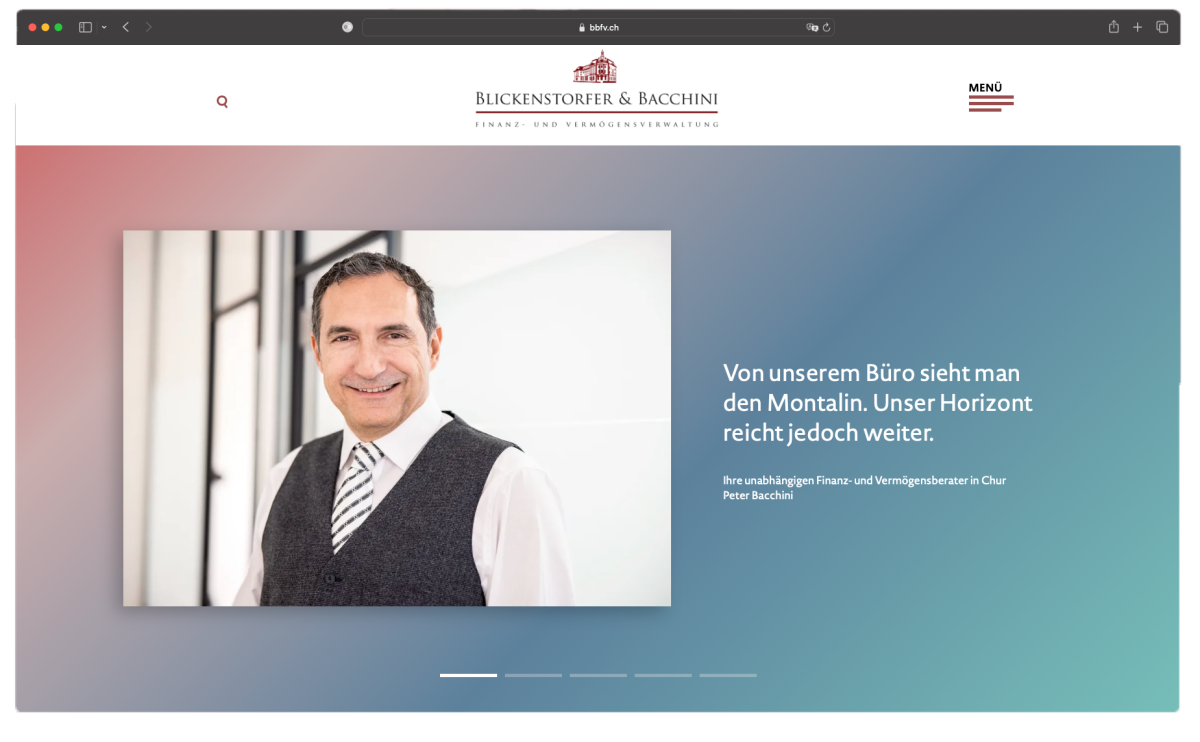 Ihre langjährige Erfahrung macht Blickenstorfer & Bacchini zu einer der führenden Finanz- und Vermögens-verwaltungen in der Region. Glaubwürdigkeit und Unabhängigkeit bilden die Basis für eine erfolgreiche Zusammenarbeit mit Kundinnen und Kunden. Blickenstorfer & Bacchini legt grossen Wert auf Fairness, Leidenschaft und Transparenz. Mit Moving-Porträts von Ausdrucksfotografie by Caroline Staeger bringen wir die Persönlichkeiten auf die Front der neuen Website www.bbfv.ch.