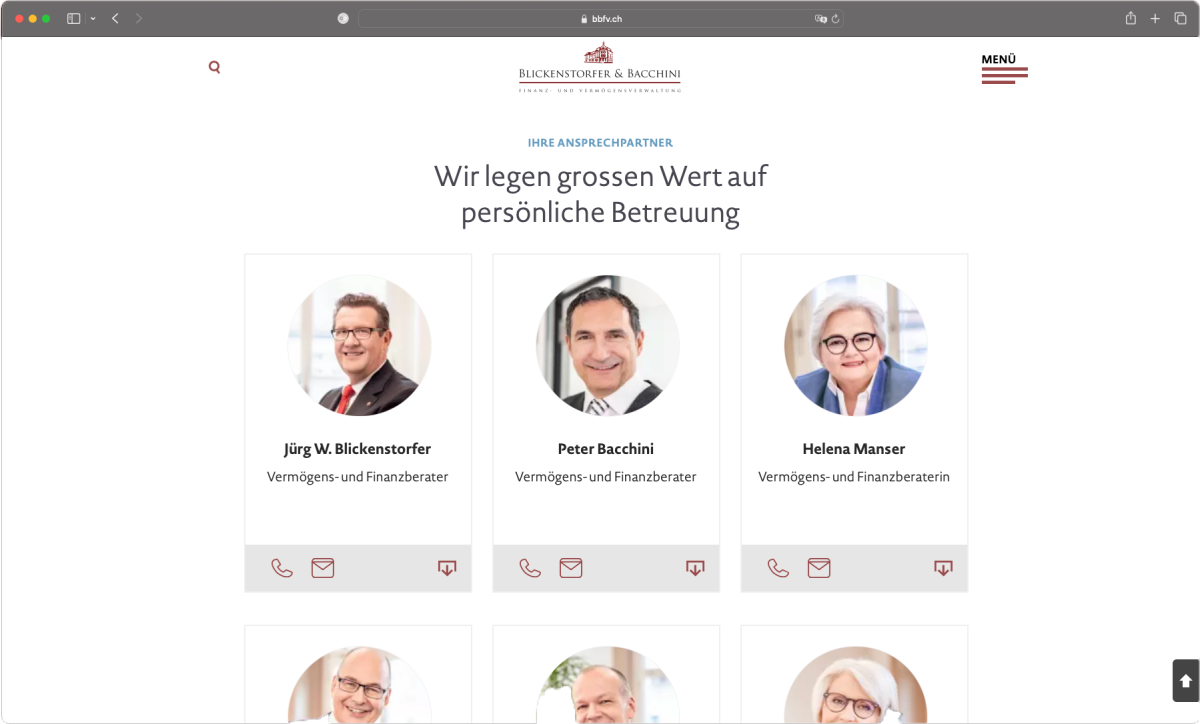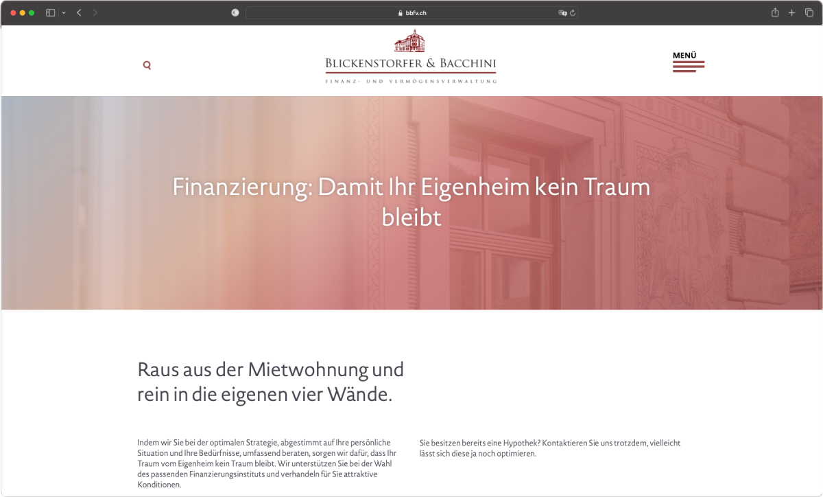 Ihre langjährige Erfahrung macht Blickenstorfer & Bacchini zu einer der führenden Finanz- und Vermögens-verwaltungen in der Region. Glaubwürdigkeit und Unabhängigkeit bilden die Basis für eine erfolgreiche Zusammenarbeit mit Kundinnen und Kunden. Blickenstorfer & Bacchini legt grossen Wert auf Fairness, Leidenschaft und Transparenz. Mit Moving-Porträts von Ausdrucksfotografie by Caroline Staeger bringen wir die Persönlichkeiten auf die Front der neuen Website www.bbfv.ch.